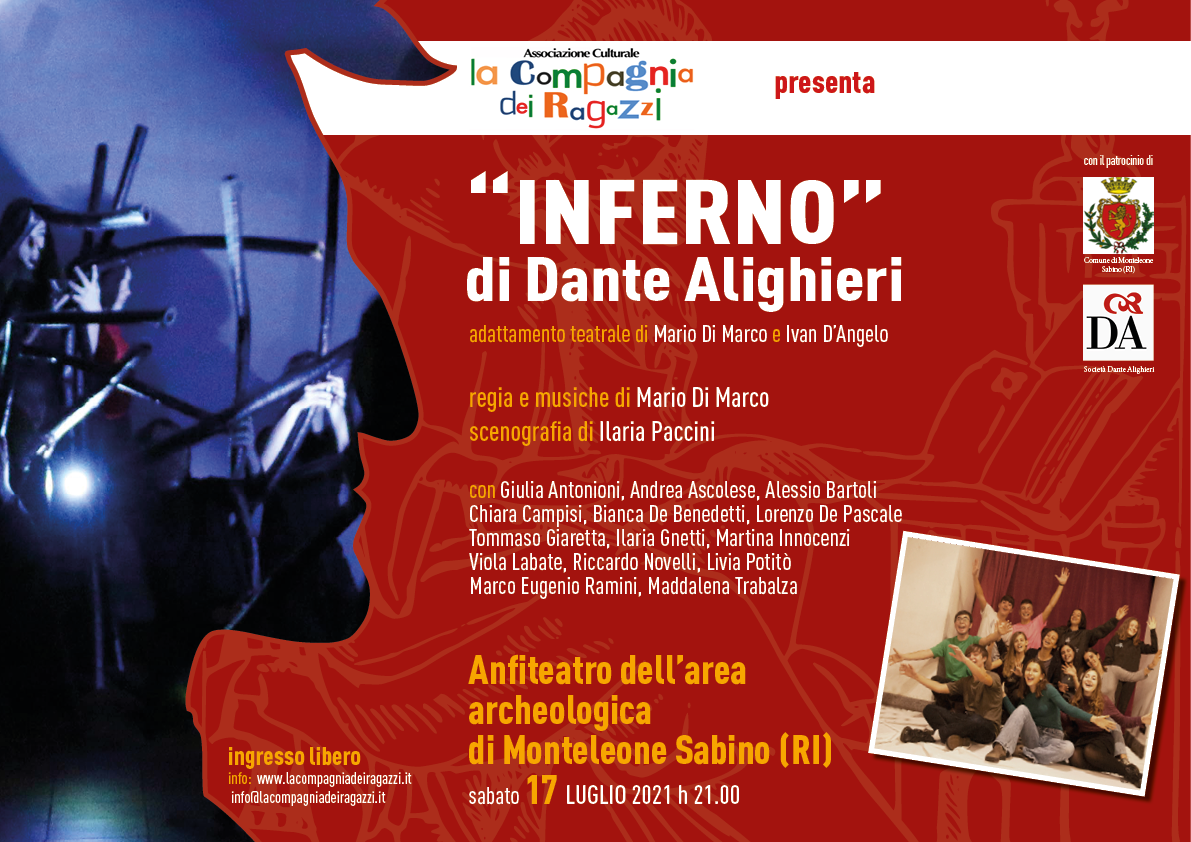 L’inferno di Dante Alighieri recitato in originale dantesco e senza adattamentI in uno spettacolo di 70 minuti che prevede, oltre alla recitazione, l’utilizzo del linguaggio astratto della musica unitamente ad effetti visivi, teatrali e scenici come torce elettriche, cellofan, corde, stoffe e altro.